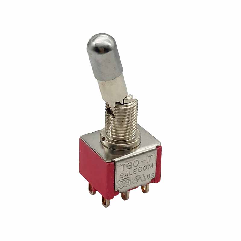 鈕子開關,搖頭開關T80-T系列,有SPDT、DPDT、3PDT、4PDT等功能,有直腳和90度彎腳,各種端子種類跟長度,各種手柄,提拉自鎖式手柄以及各種固定方式,我們產品擁有UL、ENEC并符合ROHS規范。